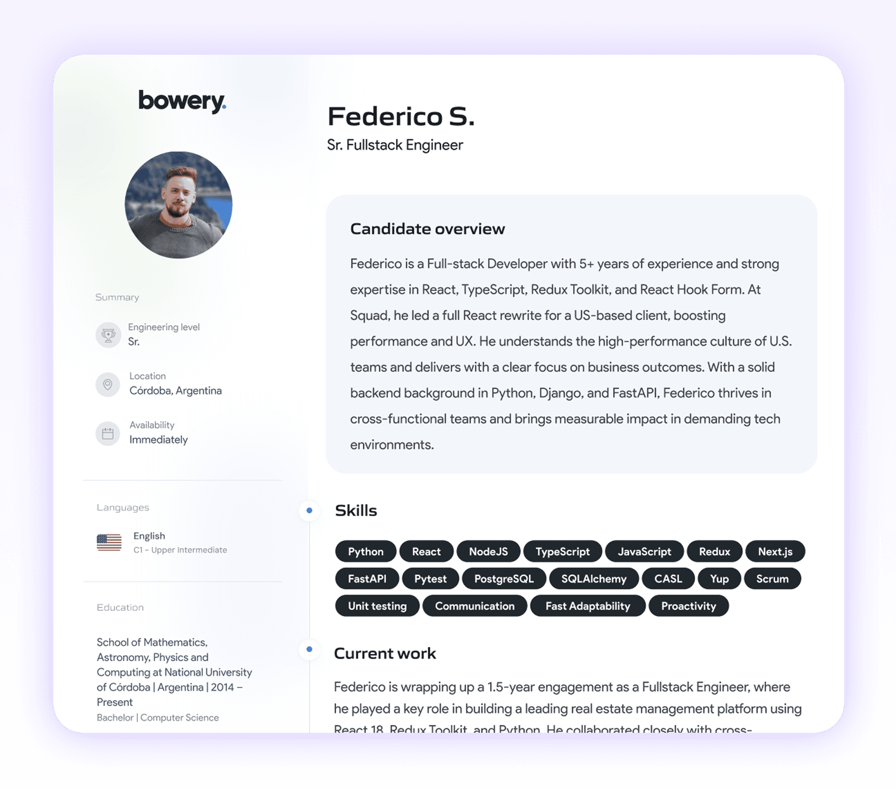 AI-powered vetting, reviewed by senior engineers. Meet aligned, high-quality profiles in under 24 hours.